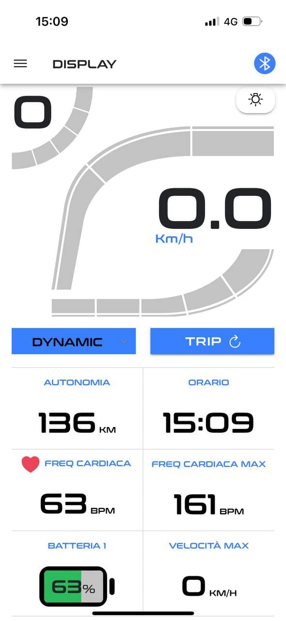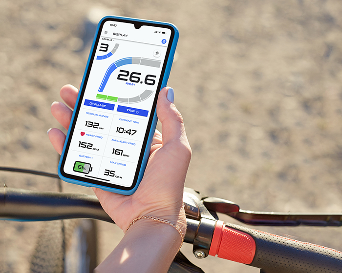 • DISPLAY: visualizza sullo smartphone l’intero display per una visione più chiara di tutti e i dati e permette di selezionare il livello di assistenza, le mappe, la funzione luci, e di resettare il trip.
