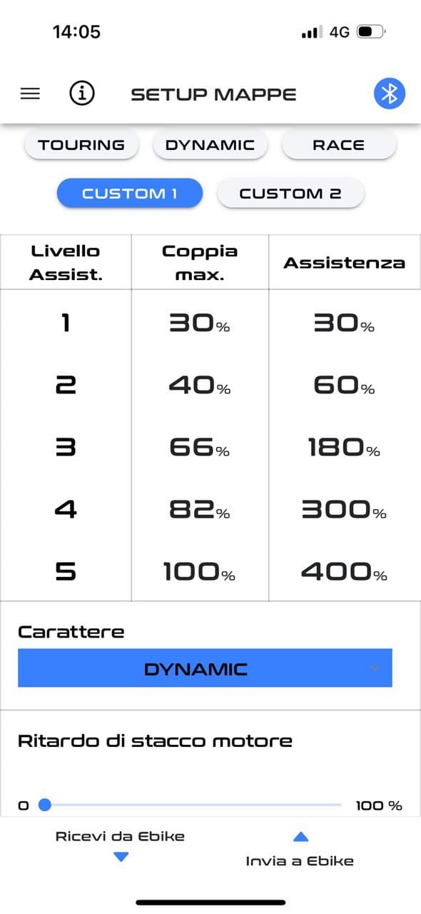 • SETUP MAPPE: possibilità di creare due mappe personalizzate (Custom 1, Custom 2) partendo dalle caratteristiche di una delle preimpostate tra TOURING, DYNAMIC e RACE.