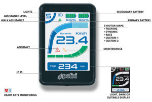 The TFT Display is easy to read thanks to the adaptive light 2,5’ color screen, with automatic adaptation of the color and intensity according to the ambient light. Furthermore it shows precisely the cyclist pedaling power, the cadence, the motor power and residual range.