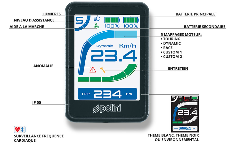 De plus, il montre d’une façon précise la puissance du pédalage du cycliste, la cadence, la puissance du moteur et l’autonomie restante.