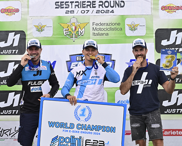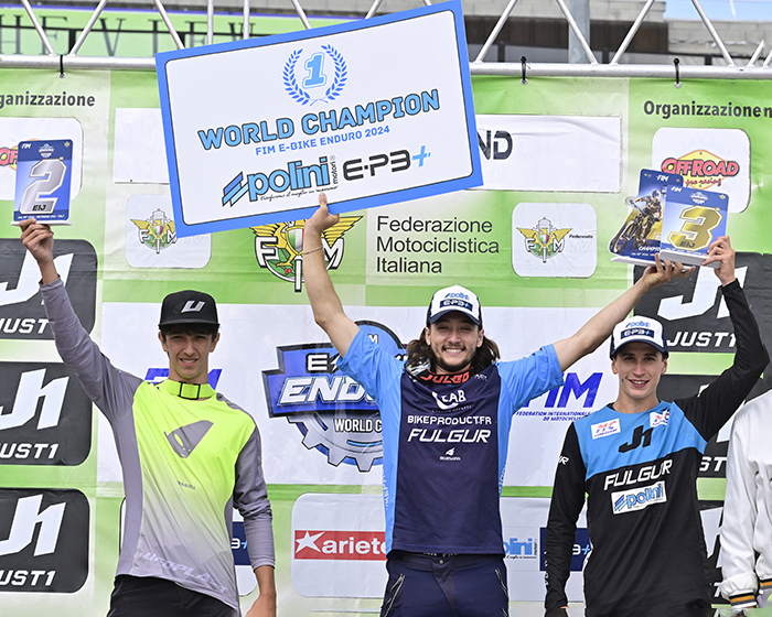 Il terzo titolo Mondiale è arrivato dalla categoria E2 (e-bike open) con un podio interamente motorizzato Polini E-P3+ MX. Vittorio Grandis su Fulgur – Polini si è laureato Campione del Mondo davanti a Davide Burini, secondo, e Giuseppe Facchinetti, terzo.